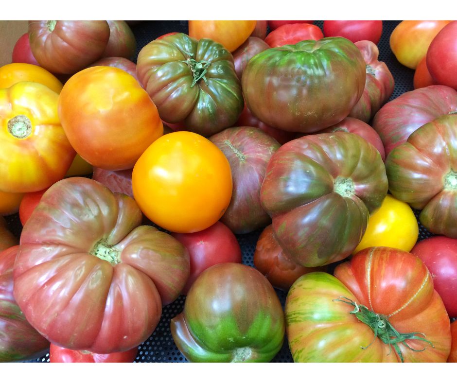 Colored tomatoes. Some are heirlooms, some are hybrids. The size will range from 4 oz to 16 oz. You can expect to find pink, yellow, orange, green (ripe or unripe), striped, and black/purple tomatoes.